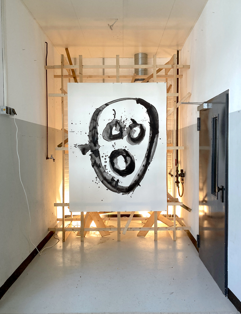 Skulpturale Installation, Holz, Licht, ca. 300 x 220 x 150 cm, mit Zeichnung auf Papier „Black Head“ (200 x 150 cm), 2025