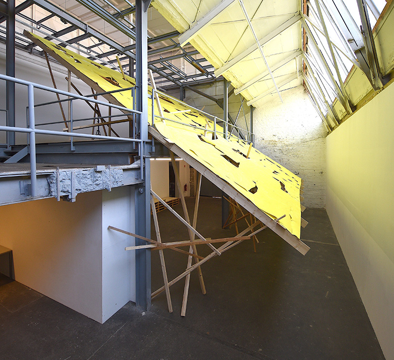 „Gelbe Schräge“, Holz, Papier, Acrylfarbe, 917 x 917 x 500 cm, 4.2021